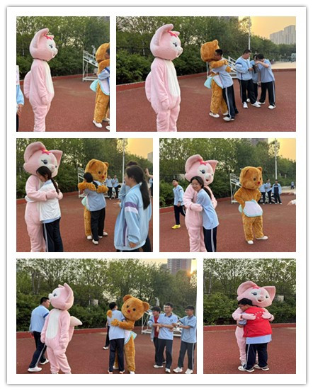 活动当天,校园里充满了欢声笑语。几个可爱的人形玩偶,圆滚滚的小熊、俏皮灵动的兔子,早早地“站”在操场的各个角落,张开双臂,等待着同学们的到来。随着下课铃声响起,活动正式拉开帷幕。一开始,有些同学还有些羞涩和犹豫,但在周围小伙伴的鼓励下,他们鼓起勇气,慢慢走向玩偶,轻轻拥抱。当同学们投入玩偶温暖的怀抱时,脸上瞬间绽放出灿烂的笑容,所有的紧张和羞涩都在这一刻烟消云散。一个拥抱,仿佛拥有神奇的魔力,能驱散学习的疲惫,抚平内心的焦虑,让快乐和温暖在彼此间流淌。