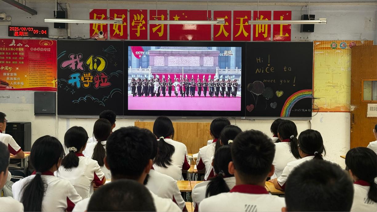 师生共赏盛世阅兵,豪情满怀抒发爱国壮志。铭记历史、缅怀先烈,珍爱和平,开创未来。虽身处教室,与天安门广场相隔山海,但师生们心怀热忱,铿锵有力的誓言与祖国心跳同频。