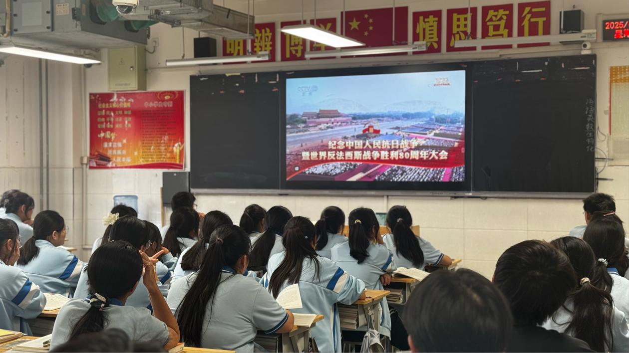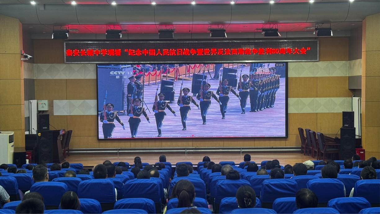 9月3日上午9时,纪念中国人民抗日战争暨世界反法西斯战争胜利80周年大会在北京天安门广场隆重举行。泰安长城中学组织全校师生共同观看了盛大的纪念活动,共同见证这一庄严而神圣的时刻。