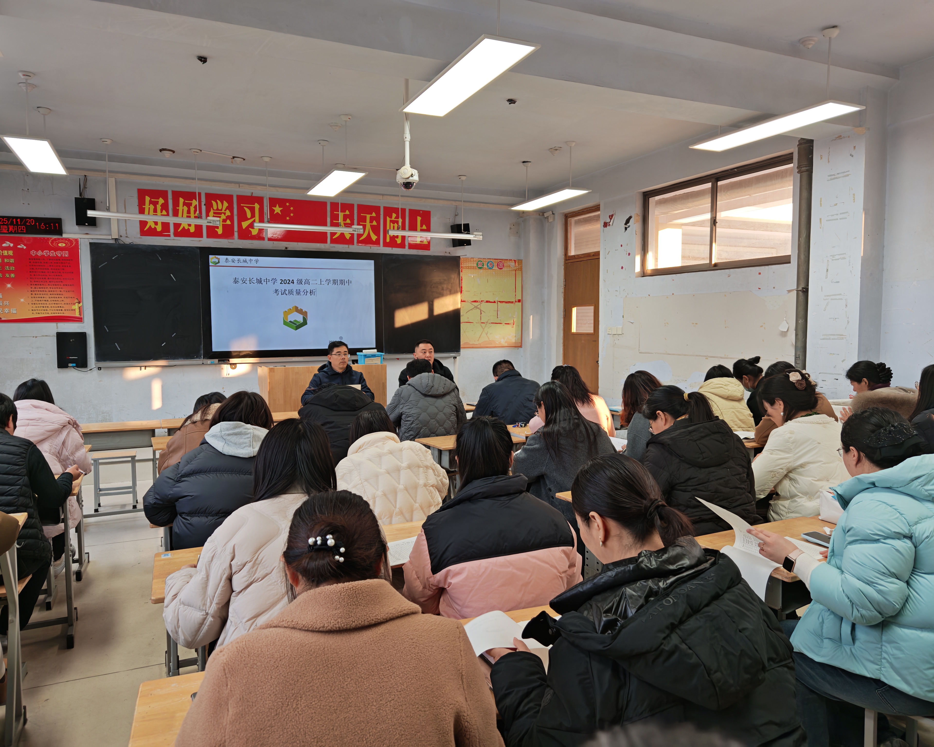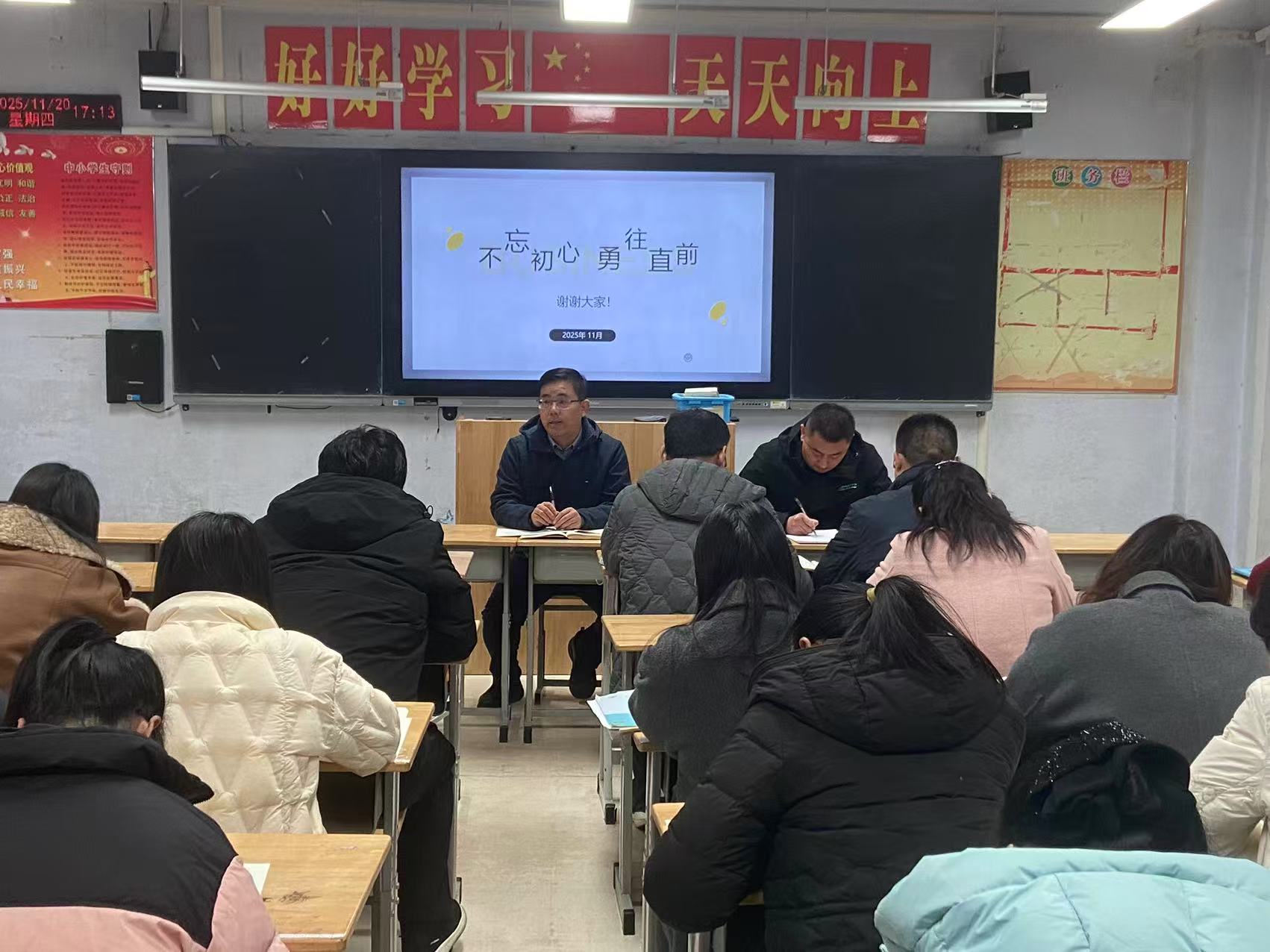 会议伊始,年级主任范新国依托详实的数据,从整体成绩、学科优势、班级均衡等维度对期中成绩进行了全面分析,肯定了前期在夯实基础、培养习惯等方面取得的阶段性成效,也客观指出了年级、班级管理及学科教学层面存在的具体问题,为精准实施教学改进提供了清晰导向与坚实依据。