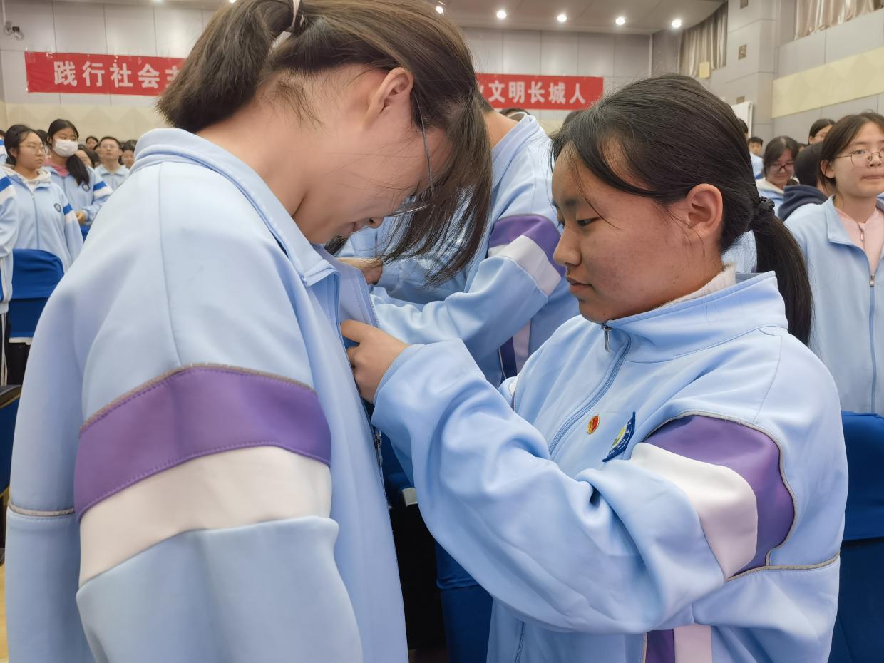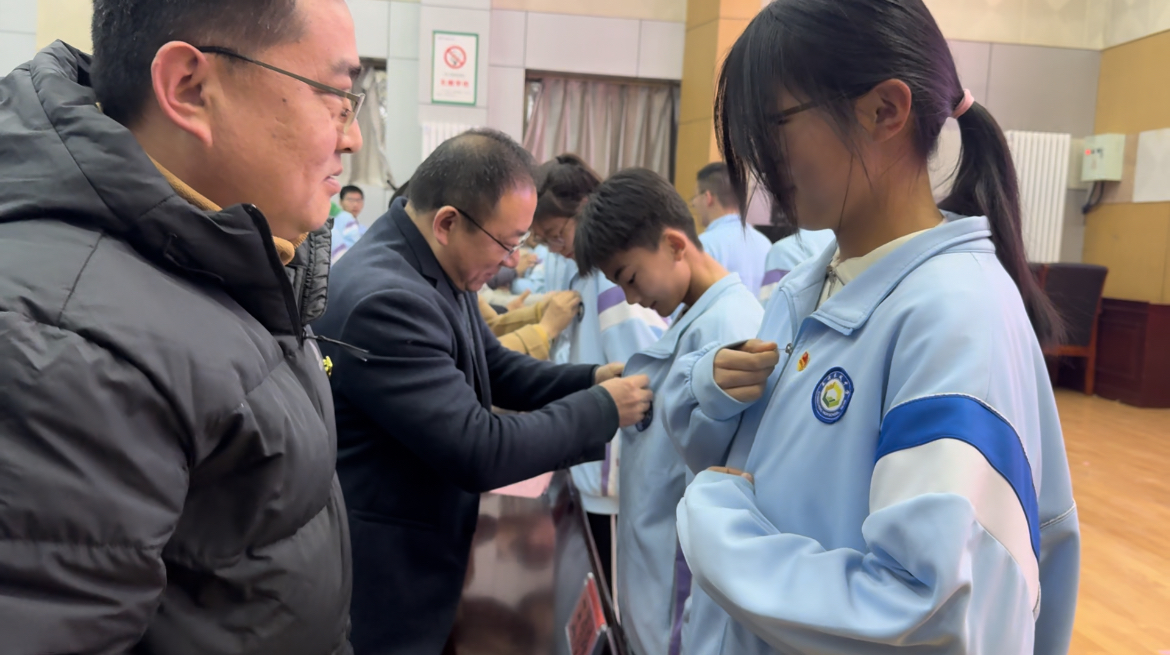 在庄重的团徽颁发环节,校领导、教师代表与老团员代表共同为新团员佩戴上熠熠生辉的团徽。这枚徽章不仅是中国共青团的象征,更承载着一份沉甸甸的责任,时刻提醒每一位团员牢记身份,朝着党指引的方向奋勇前进。